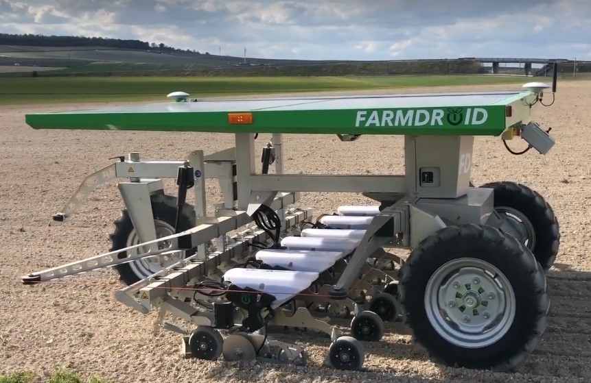 Le robot FarmDroid FD20 est autonome, l’énergie est fournie par des panneaux solaires et un stockage sur batteries lui permet de travailler la nuit : fonctionnement 24h/24. Il permet de semer et biner sur 6 rangs à 45 ou 50 cm. Le dispositif de positionnement GPS RTK enregistre l’emplacement de chaque graine sur chaque rang au moment du semis ce qui permet ensuite d’effectuer les désherbages entre rang et sur le rang sans avoir recours à une caméra. Initialement destiné aux cultures de betteraves à sucre, le robot FarmDroid permet également de semer et désherber colza, chou, persil, herbes aromatiques, épinard…